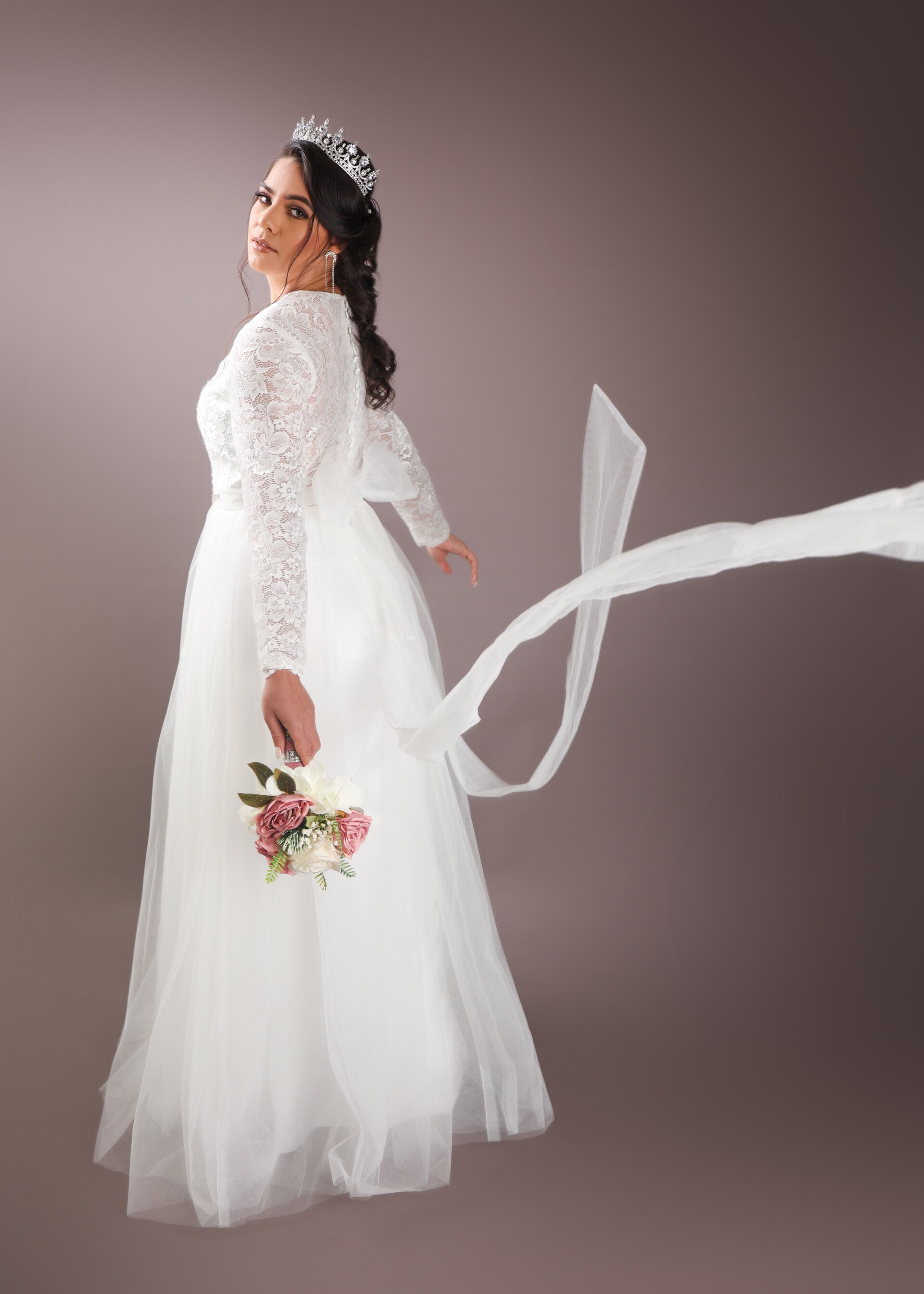 Las mangas largas, confeccionadas en un tul ligero, añaden un toque de romanticismo y elegancia.
